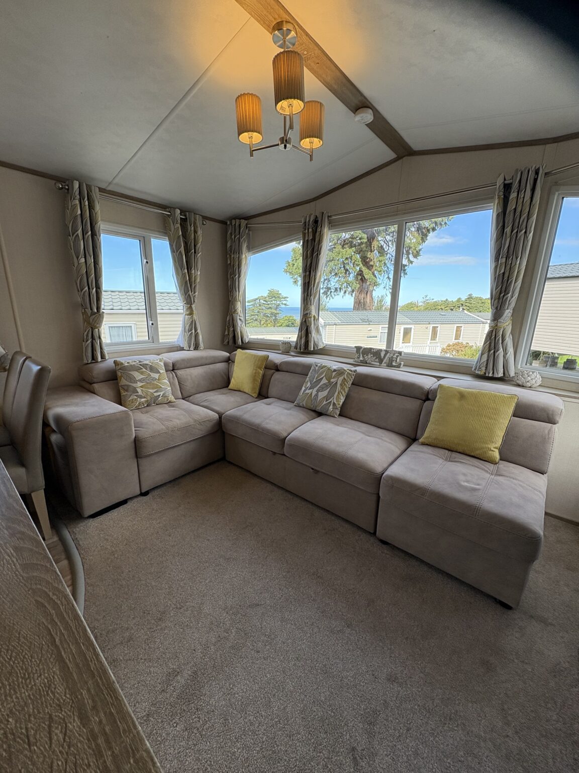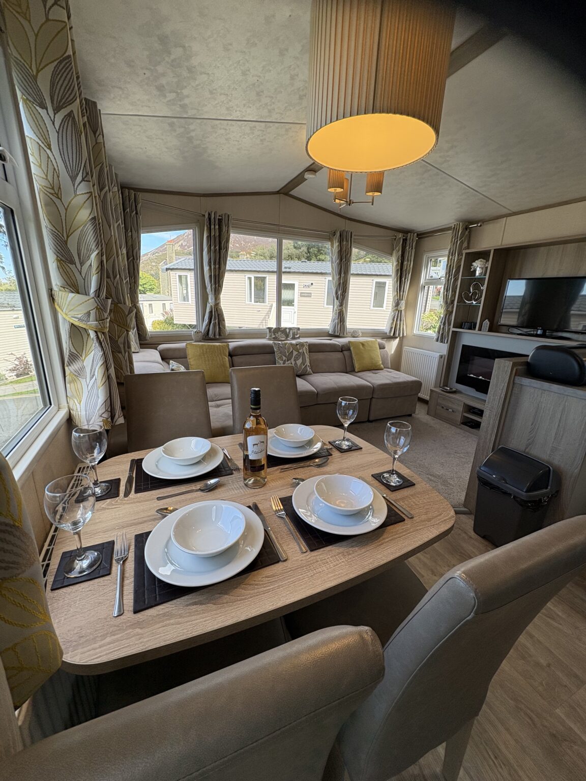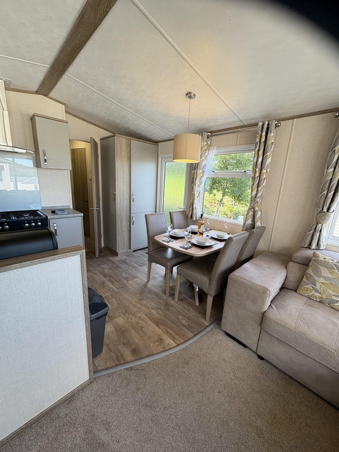 The 2021 Carnaby Oakdale offers a perfect balance of style and practicality, with a modern open-plan design that feels spacious and welcoming from the moment you step inside. Soft, neutral tones and subtle accents create a calming atmosphere throughout, while large windows fill the living space with natural light. The lounge invites relaxation with its freestanding seating and homely touches, leading seamlessly into a well-appointed kitchen and dining area designed for effortless holiday living.