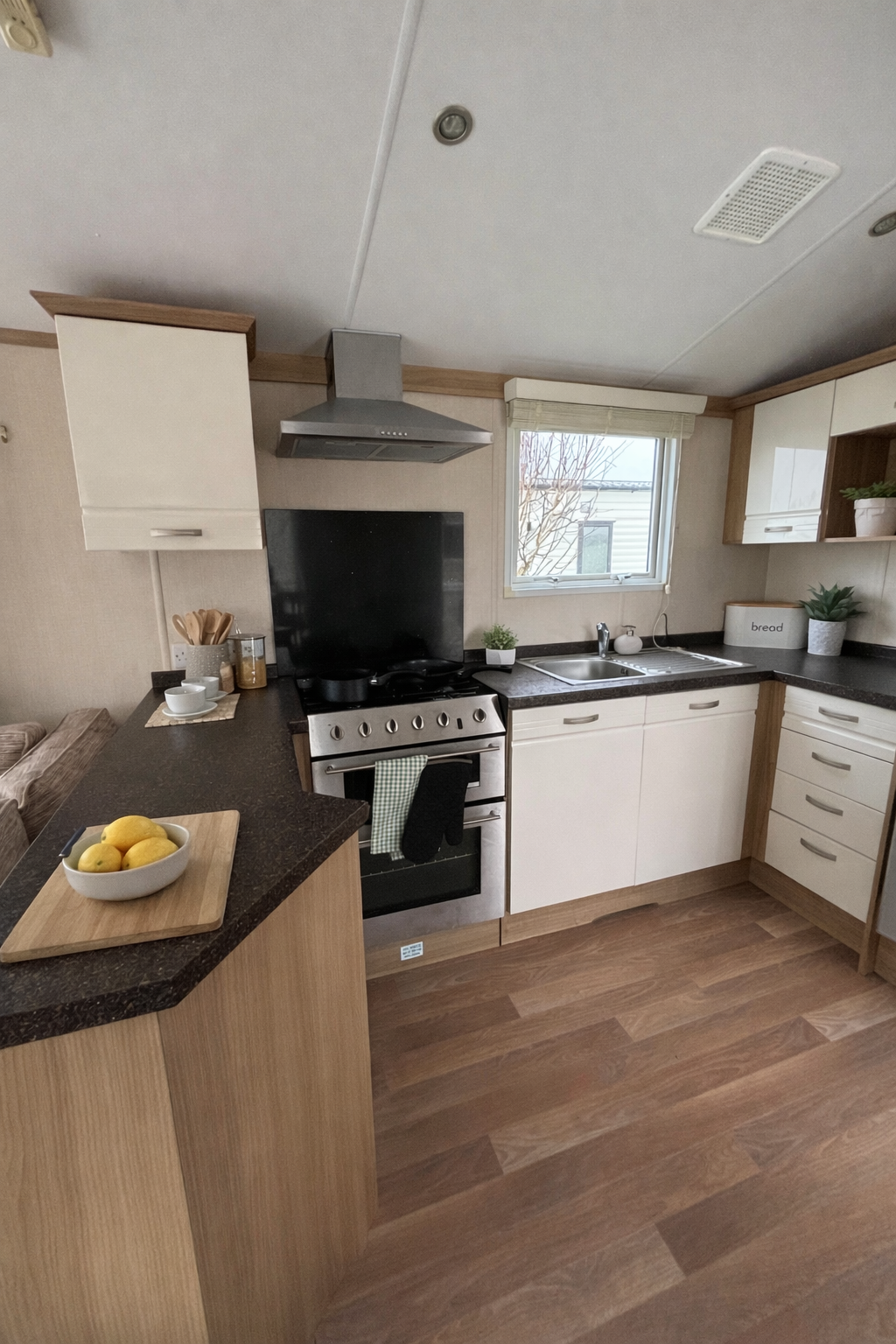The dining area is positioned alongside the living space and includes a freestanding table and chairs, ideal for mealtimes and entertaining. The stylish fitted kitchen offers plenty of cupboard and worktop space and comes complete with a gas oven and hob, extractor and integrated fridge freezer, making it both practical and functional for holidays.