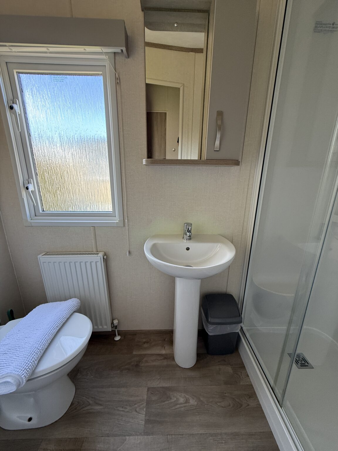 A well-appointed family bathroom features a full-size shower, sink, WC, and a towel radiator for extra comfort.