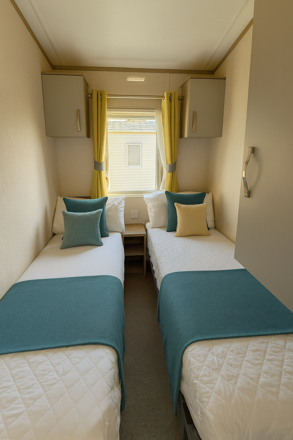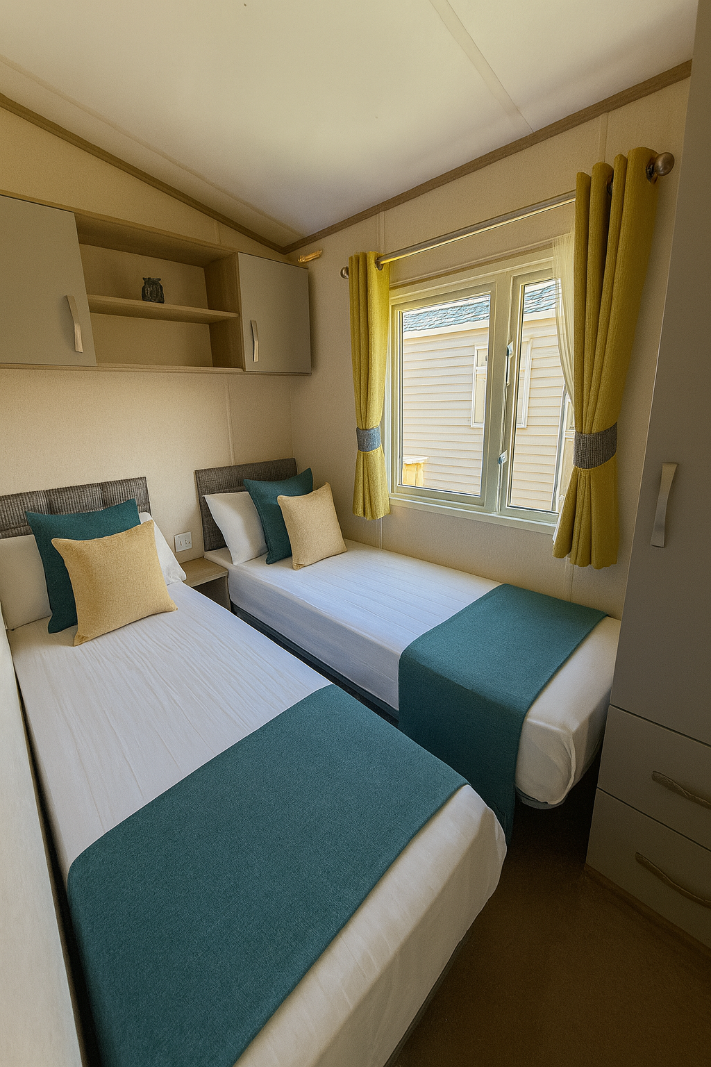 The master bedroom offers a tranquil retreat with a plush double bed, fitted wardrobe, bedside units, and en-suite facilities for added privacy. Two twin bedrooms provide additional space, each with single beds, a fitted wardrobe, overhead storage, and a bedside unit.
