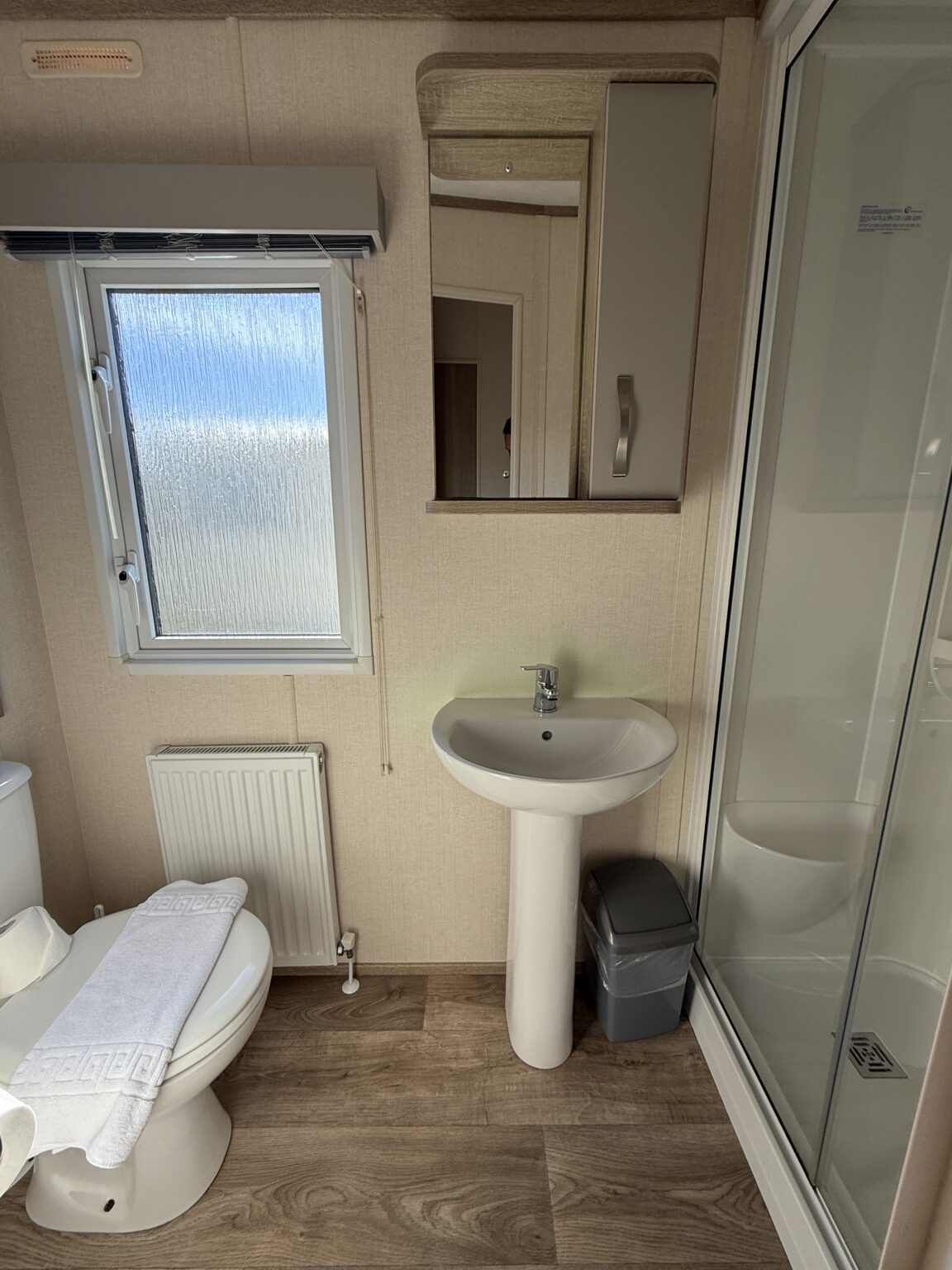 A well-appointed family bathroom features a full-size shower, sink, WC, and a towel radiator for extra comfort.