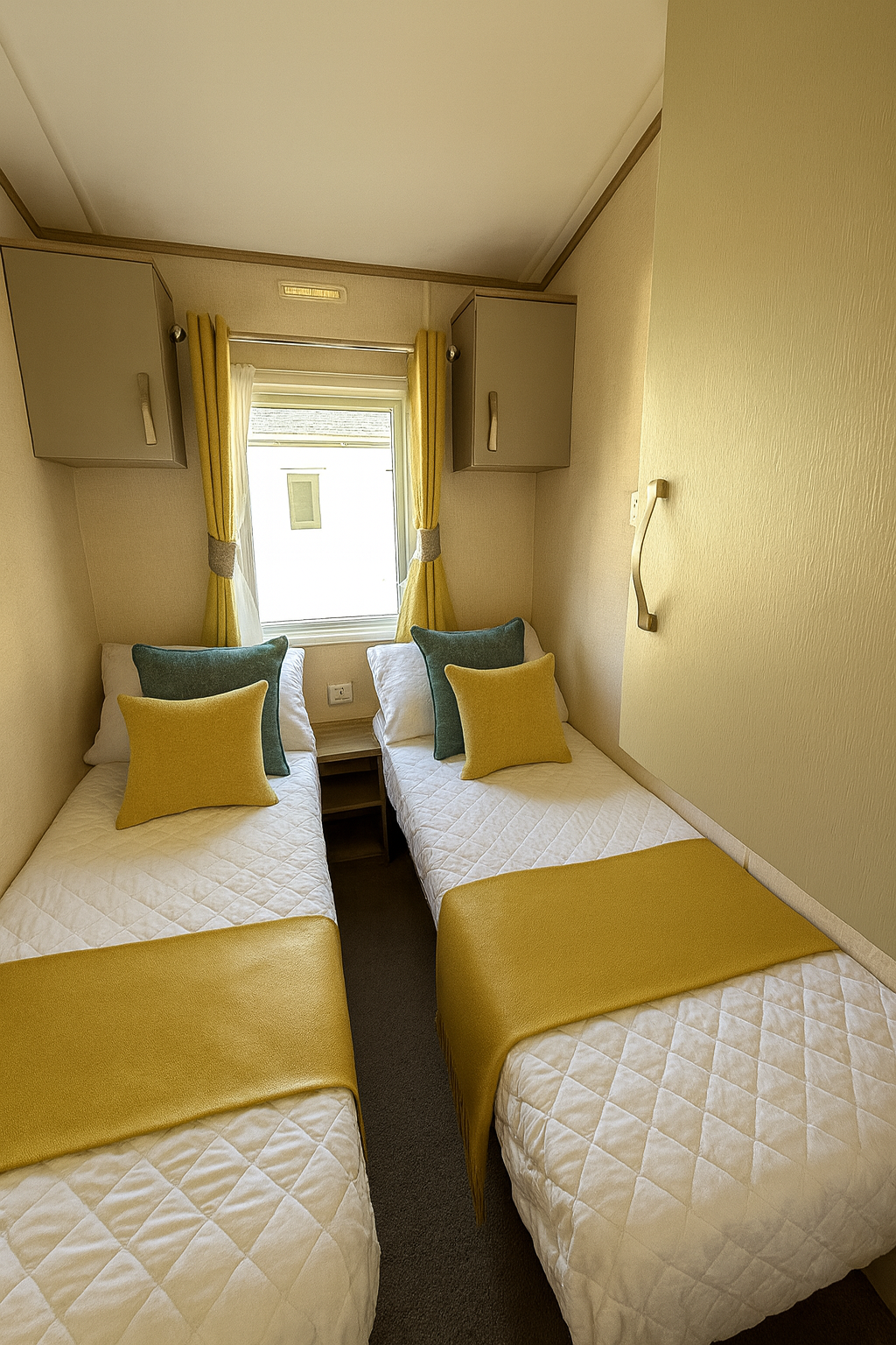 The master bedroom offers a tranquil retreat with a plush double bed, fitted wardrobe, bedside units, and en-suite facilities for added privacy. Two twin bedrooms provide additional space, each with single beds, a fitted wardrobe, overhead storage, and a bedside unit.