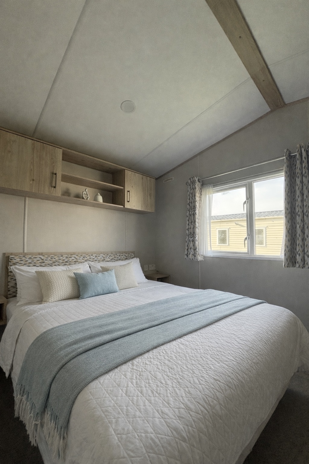 Master Bedroom: Spacious master bedroom with a comfortable double bed. Overhead storage offers extra space. Fitted wardrobe for clothing and essentials. Bedside tables add convenience.