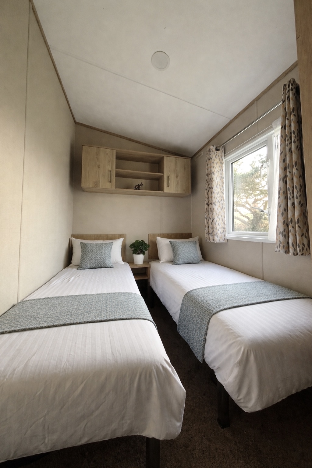 Twin Bedroom: Single beds. Overhead storage and fitted wardrobe provide extra space.