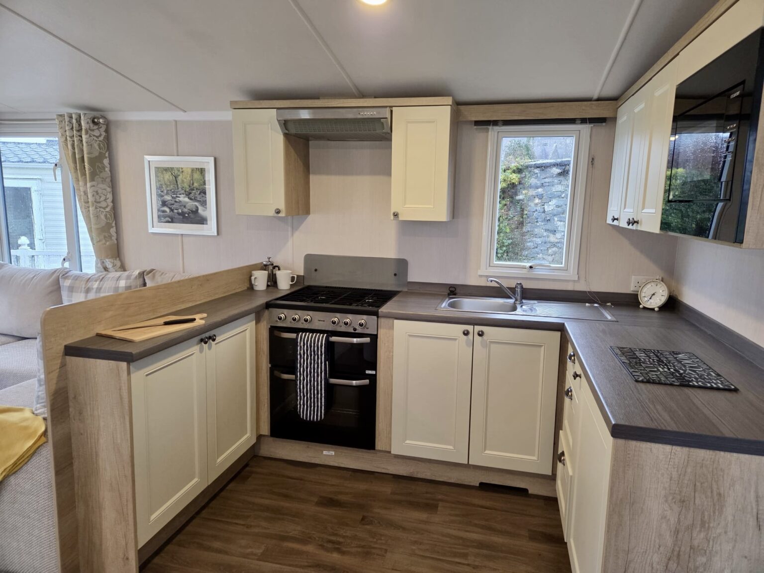- The kitchen offers a huge amount of practicality with its ample storage and space. There’s also some overhead cupboard storage too, plus an oven/grill and four burner hob with extractor fan. Swift also include an integrated microwave, oven and separate fridge/freezer.