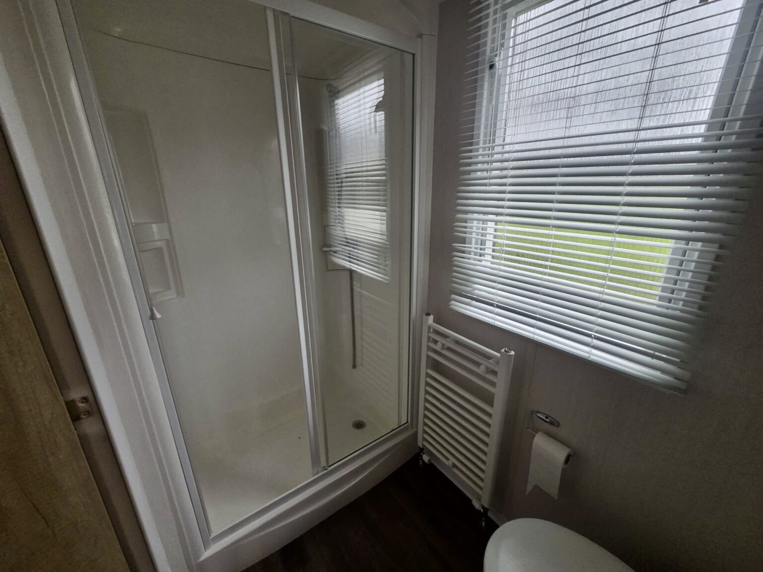 - The bathroom boasts a full size shower and ample shelving for everyday comfort.