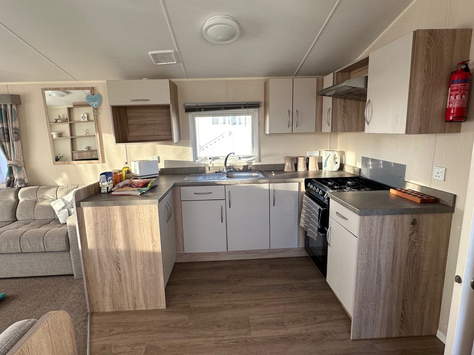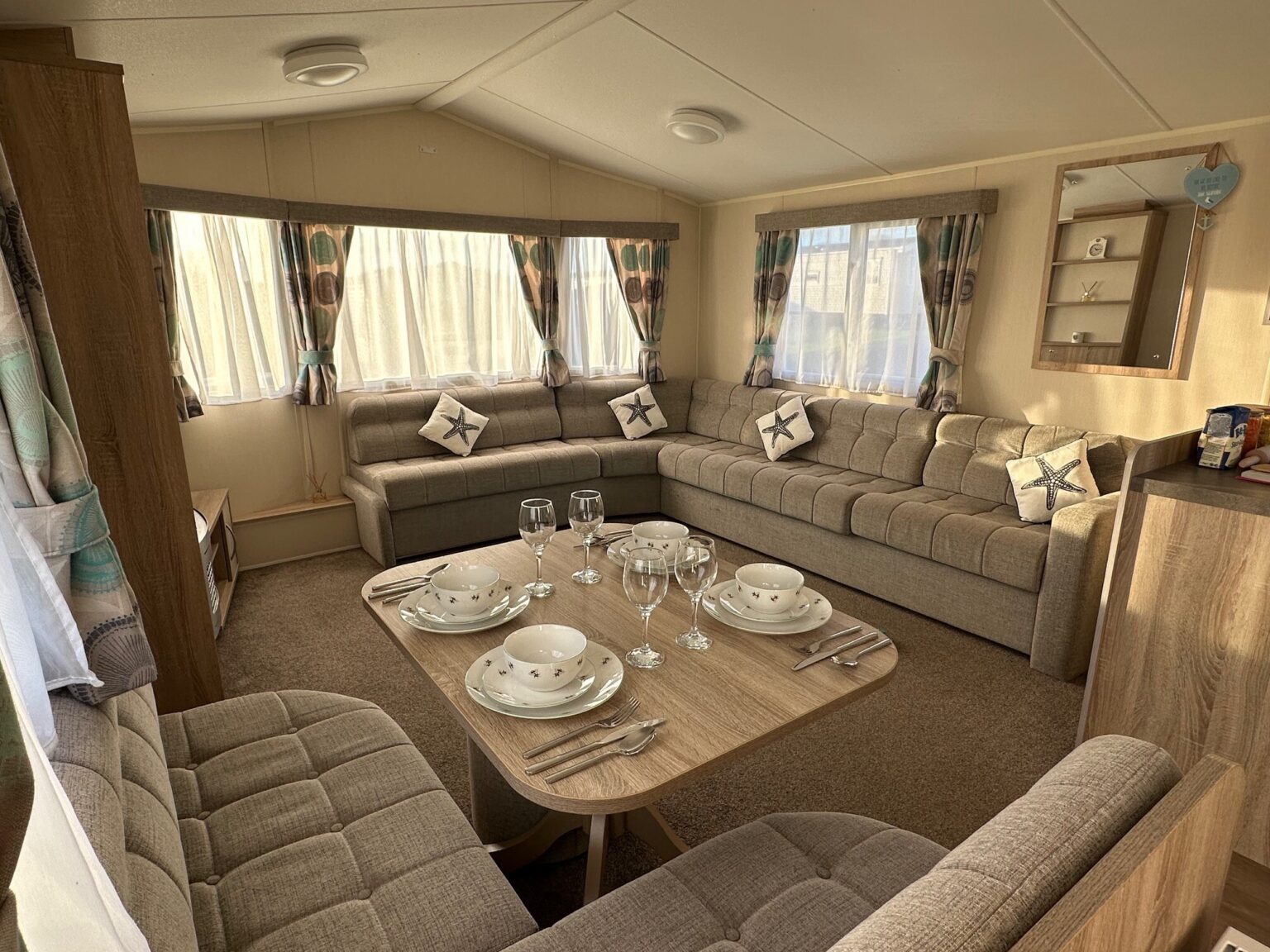 • Large open plan lounge with fixed seating, free standing TV unit and gas fire.