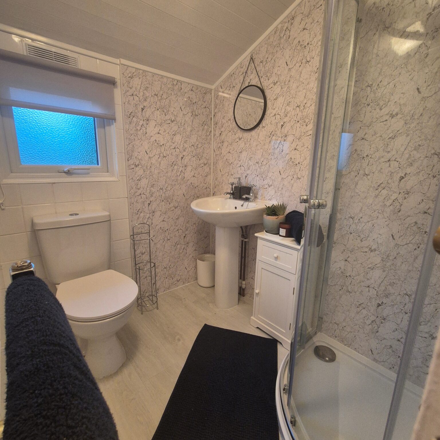 - Spacious bathroom with large corner shower, newly fitted bathroom wall panels.